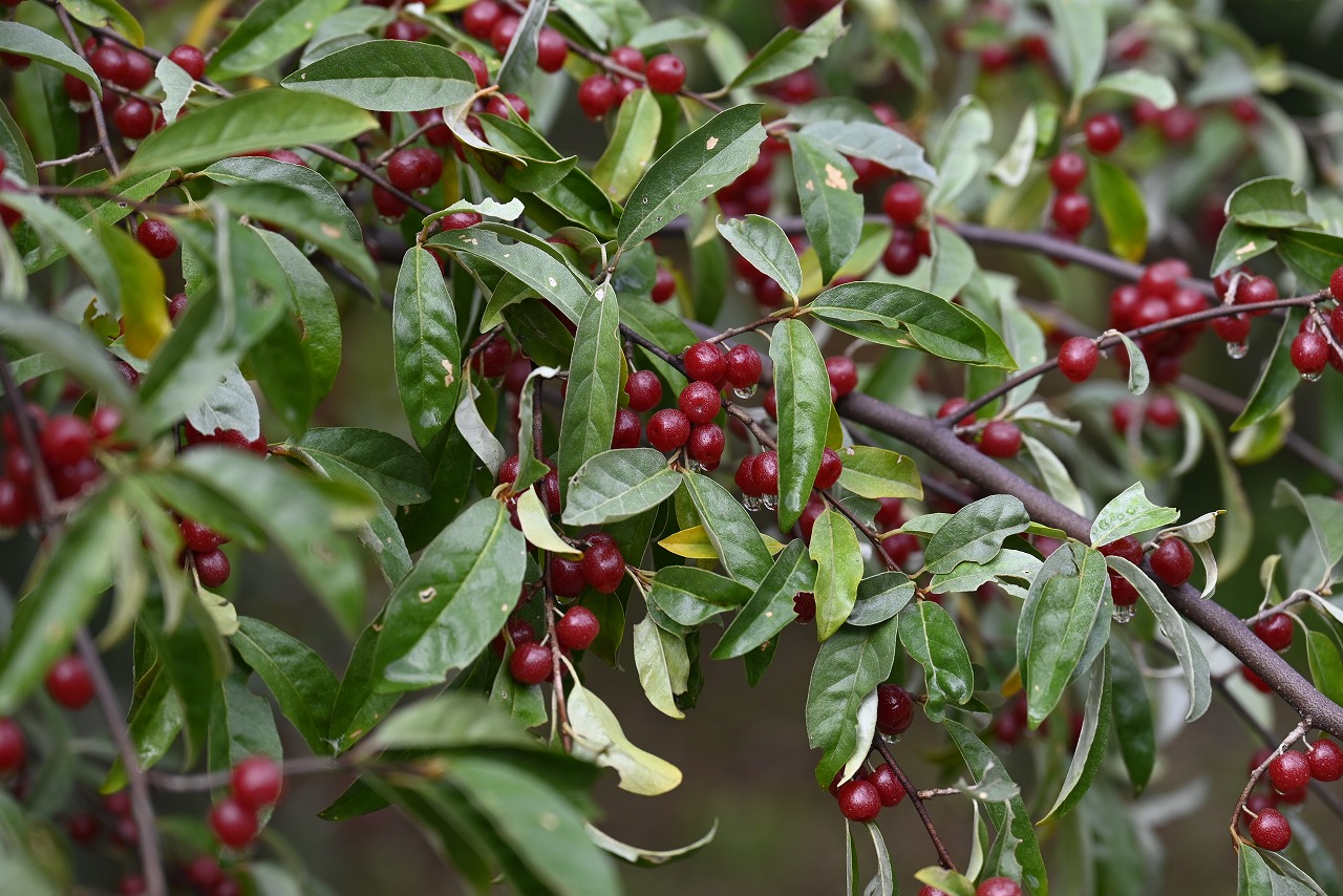 アキグミの果実です。 グミ科グミ属の落葉低木です。 春に花が咲きますが、その後はあまり変化がありません。 8月に入ると、急に丸く膨らみ始め赤く熟します。 果実はおいしそうに見えますが、そのまま食べるとえぐみがあります。 果実酒にすると澄んだ赤い色となり、きれいな果実酒となります。 |