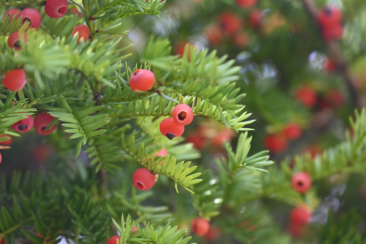 イチイの果実です。 イチイ科イチイ属の樹木です。 正一位の笏(しゃく)を作ったことから、この名前が付いたと言われています。 イチイの実の赤い部分は食べることができますが、黒い種子の部分には毒が含まれているので、噛まないように食べる必要があります。 |
